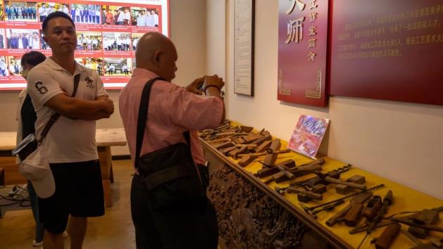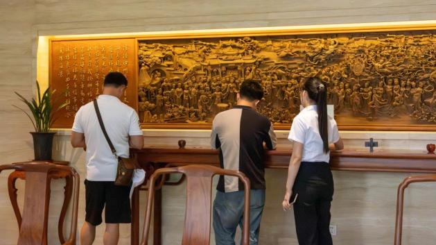 随后踏入春晖木雕艺术馆,国家级非遗传承人郑春辉的《千里江山图》木雕巨作赫然眼前——6.3米长的檀香木上,层峦叠嶂以精微透雕技法跃然而出。当学徒现场演示“方寸乾坤”的刻刀绝技时,台湾营员忍不住轻触木纹:“每道刀痕都是与历史的对话。”