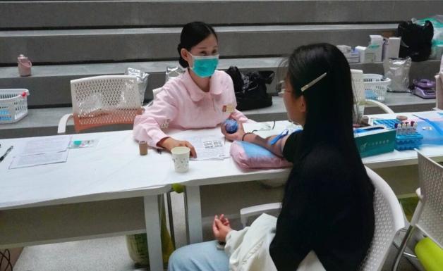 活动现场分为填表区、体检区、采血区和休息区,流程清晰、秩序井然。同学们认真填写献血登记表,一笔一划间是承诺更是担当;医护人员细致询问健康状况,志愿者们暖心引导,整个流程严谨中透着温情。