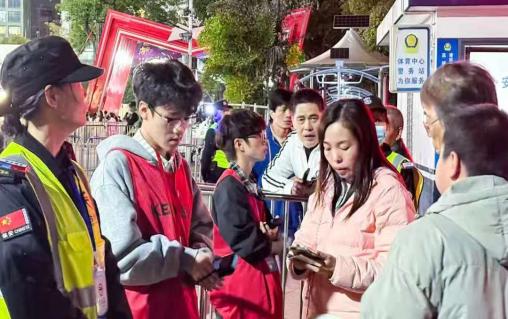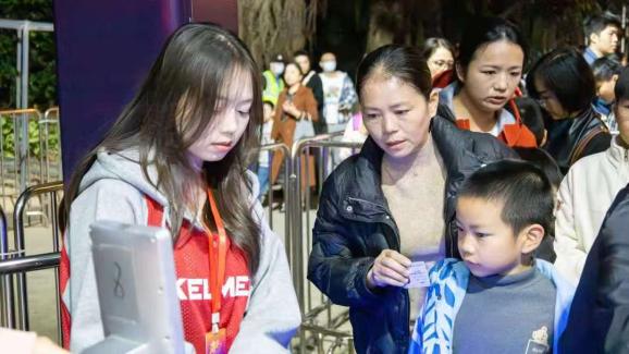 检票口前,志愿者们身着统一志愿服装,神情专注而耐心。他们熟练地接过入场凭证,快速核对信息、撕票或扫码,动作利落却不失温和,尽量缩短观众的等候时间。遇到不懂操作电子票的观众,他们会俯身细致讲解;面对着急入场的人群,他们始终保持微笑,轻声引导“请大家排好队,依次检票,不要着急”,用专业态度筑牢活动入场的第一道防线。